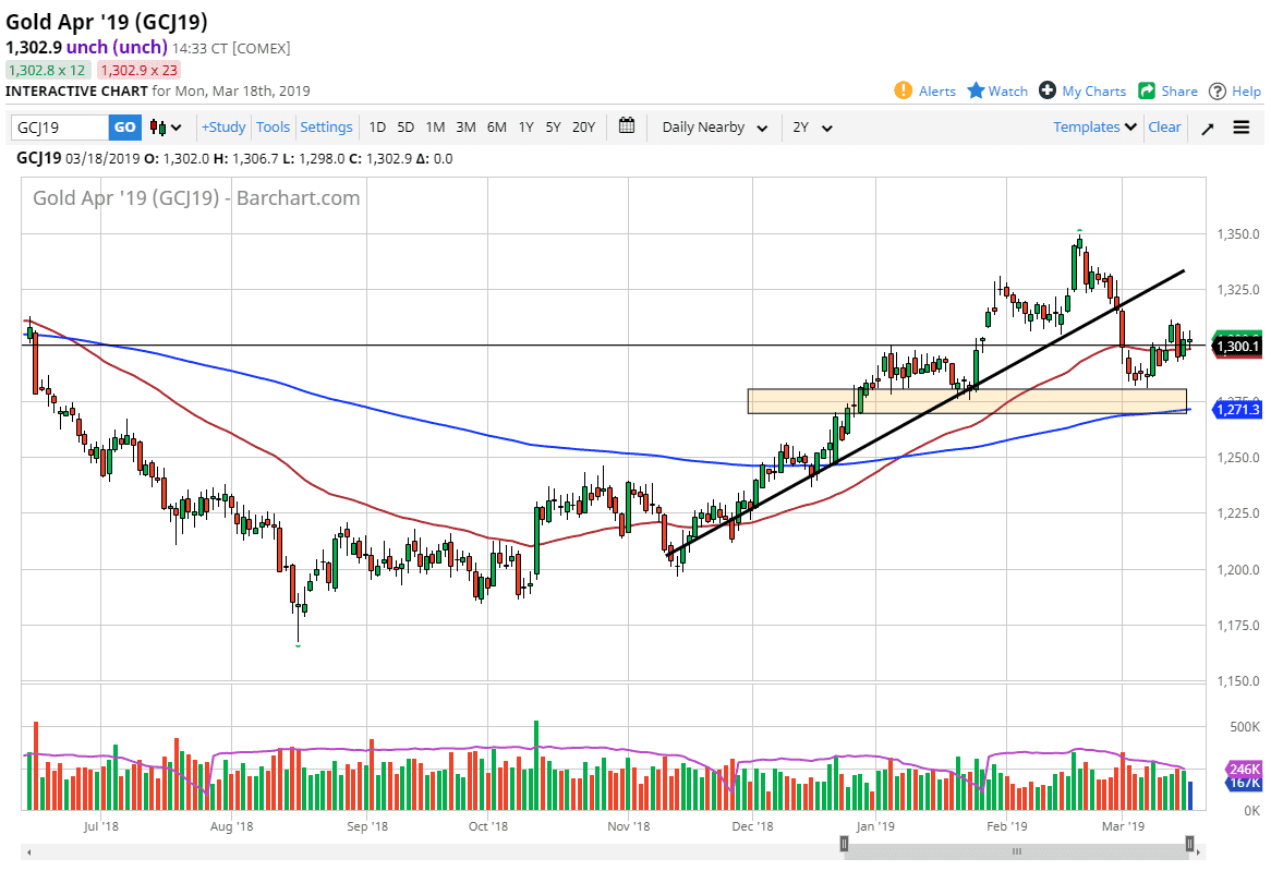 Gold markets went back and forth during the trading session on Monday, as we continue to tread water just above the $1300 level. Overall, this is a market that continues to see a lot of action in this area, but I also notice a couple of other things that matter here. After all, we have the 50 day EMA and previous resistance that is now supported. With that type of market structure in this area, it makes quite a bit of sense that we would continue to find buyers in this region.