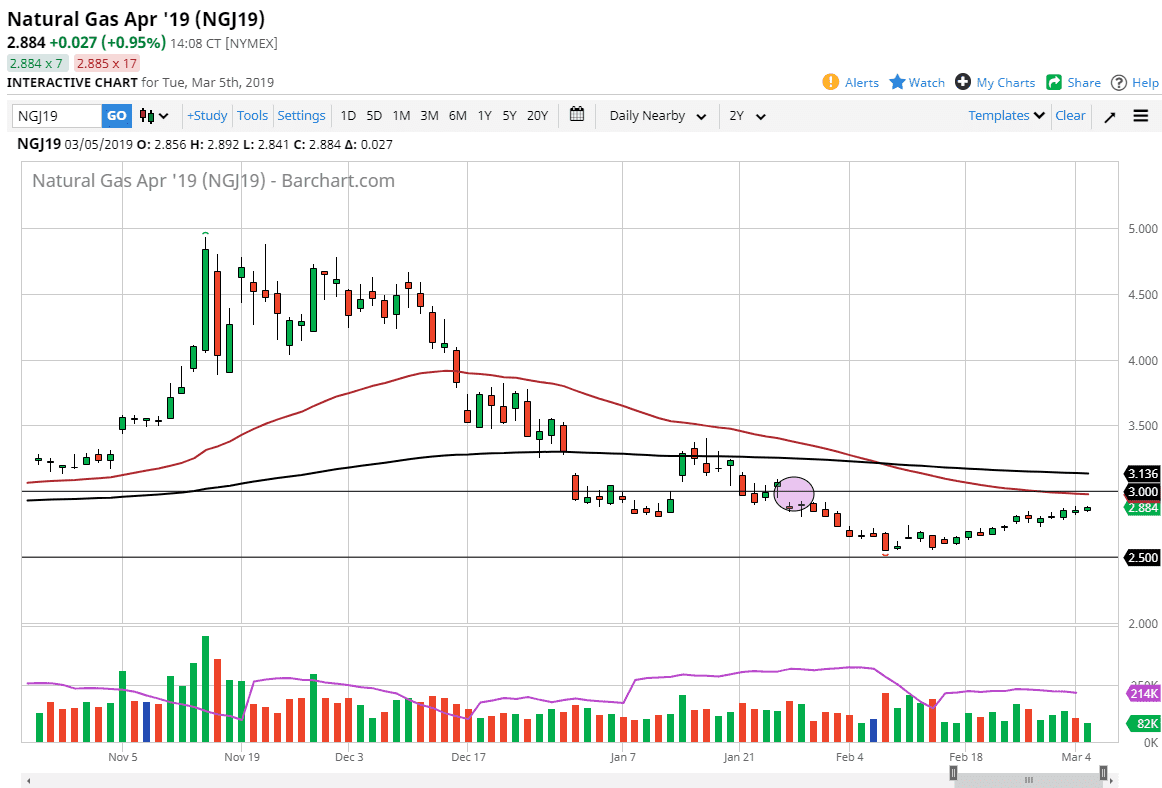 Natural gas markets rallied slightly during trading on Tuesday, as we continue to grind towards the $3.00 level. That’s an area that has a gap at it, and that of course should cause a certain amount of resistance. At the first signs of failure on the rally in that region, I will not hesitate to start selling at that point. Beyond that, the 50 day EMA is currently sitting in that level, so I think there is going to be far too much from a technical standpoint for the buyers to go into this market and rally much further. Even if they do, the $3.13 level above features the 200 day EMA, so I think it’s much easier to short this market on signs of exhaustion that it is anything else.
