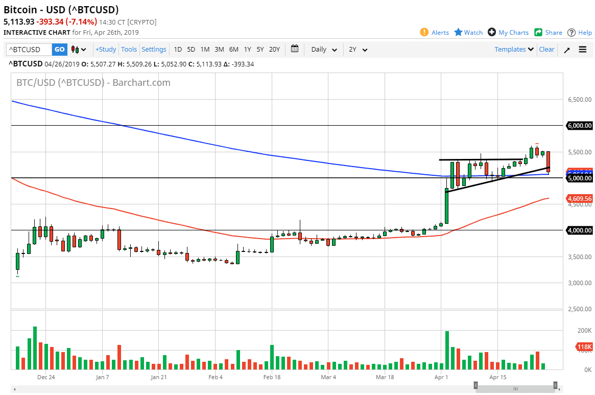 Bitcoin broke down significantly during the trading session on Friday, to close out the week with a very bearish candle stick. This was a bit of a surprise but there are couple things to pay attention to as we have formed such a striking candlestick.