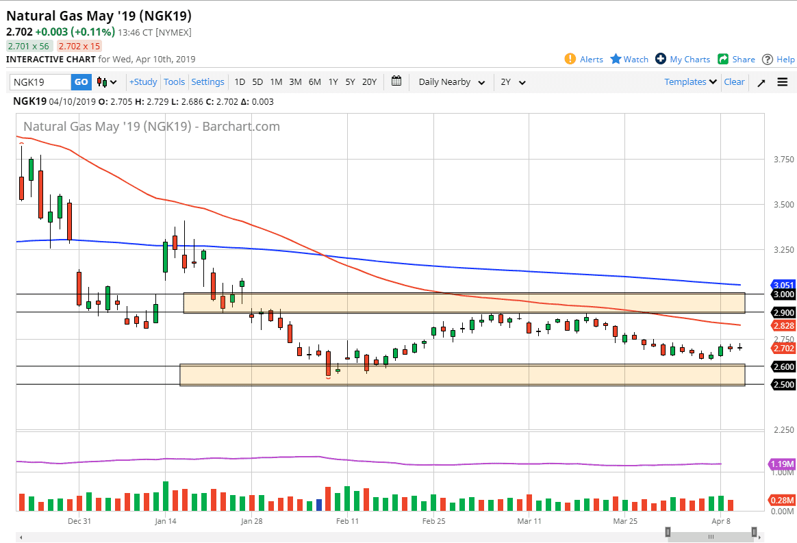Natural gas markets continue to do very little as we are not necessarily near a support or resistance area. The markets have been consolidating for some time now. The resistance of course is down at the $2.60 level still, extending down to the $2.50 level. The resistance above is at the $2.90 level that extends to the $3.00 level. Overall, I think we stay in this range for quite some time, so the fact that we are trading around $2.70 doesn’t really give me much faith in one direction or the other. I know that the inventory number comes out, and that can have a short-term effect but probably fleeting at best.