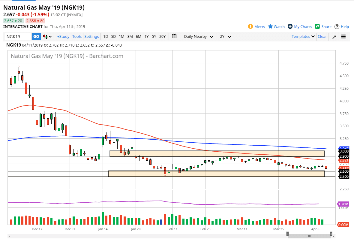 Natural gas markets fell a bit during the trading session on Thursday as the inventory number was of course a bit more bearish than expected. That being the case, it looks like we are going to drop down towards the $2.60 level, which is the beginning of massive support barrier that goes all the way down to the $2.50 level underneath. Any sign of a bounce on the short-term chart is probably an opportunity to pick up natural gas for a quick move, but I would not be expecting some type of major bullish change in attitude. Keep in mind that we have been stuck in a trading range for some time, and as we are in the wrong time of year to have overly bullish action, it makes sense that we will probably just bounce around between the $2.90 level and the $2.60 level as I have marked on the chart.