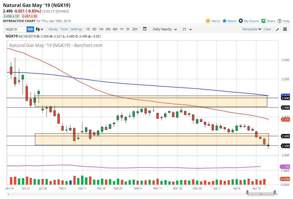 Natural gas markets fell again during the trading session on Thursday, as we continue to bounce around the $2.50 level, an area that is the bottom of a larger consolidation area. At this point, the buyers better show up soon or we are heading towards the $2.40 level. A bounce would make sense but we need to see a break above the top of the candle stick for the Thursday session, which then could open the door to the $2.60 level, and then possibly the $2.70 level.