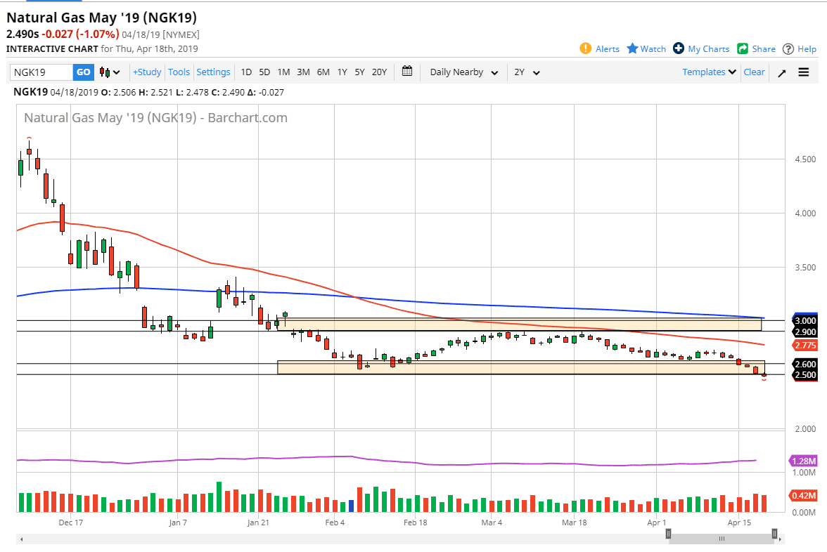 Natural gas markets continue to press lower, breaking the $2.50 barrier slightly on Thursday. This of course is a very negative turn of events and could put significant pressure on this market and cause a bit of a capitulation. The $2.50 level is indeed crucial for the longer-term range and it now looks as if it’s being seriously threatened. Underneath here, the next logical place for minor support will be the $2.40 level, and then eventually the $2.25 level.