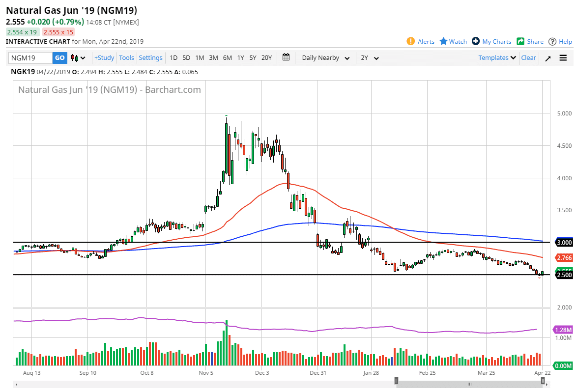 Natural gas markets continue to meander at very low levels, as we are starting to switch contracts. The $2.50 level is the bottom of the larger consolidation area that goes back a couple of years, and although the level is crucial, we are starting to see the market really grind away at the level and it very well could break. When that happens, it could open up the trap door down to $2.25 below. However, a rally is very possible as well, and we could reach towards the $2.70 level where I suspect that there would be sellers. Looking at the chart, it’s obvious that the downward pressure has been relentless.