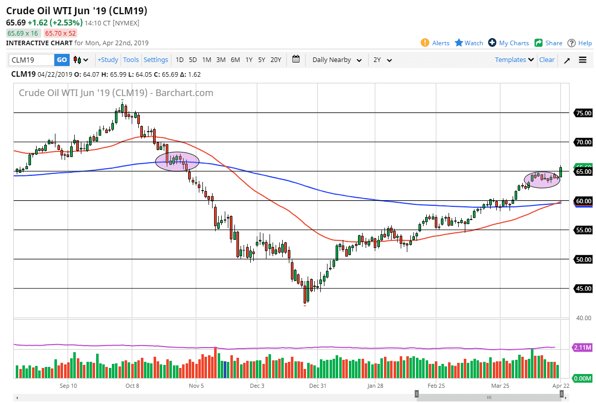 The WTI Crude Oil market broke higher during Asian trading as word got out that the Trump administration was going to revoke waivers for countries that were buying Iranian oil. This means that sanctions would be levied on certain countries such as China and Japan, and many others. This of course had the markets rocking back and forth, and as a result crude oil markets shot higher.