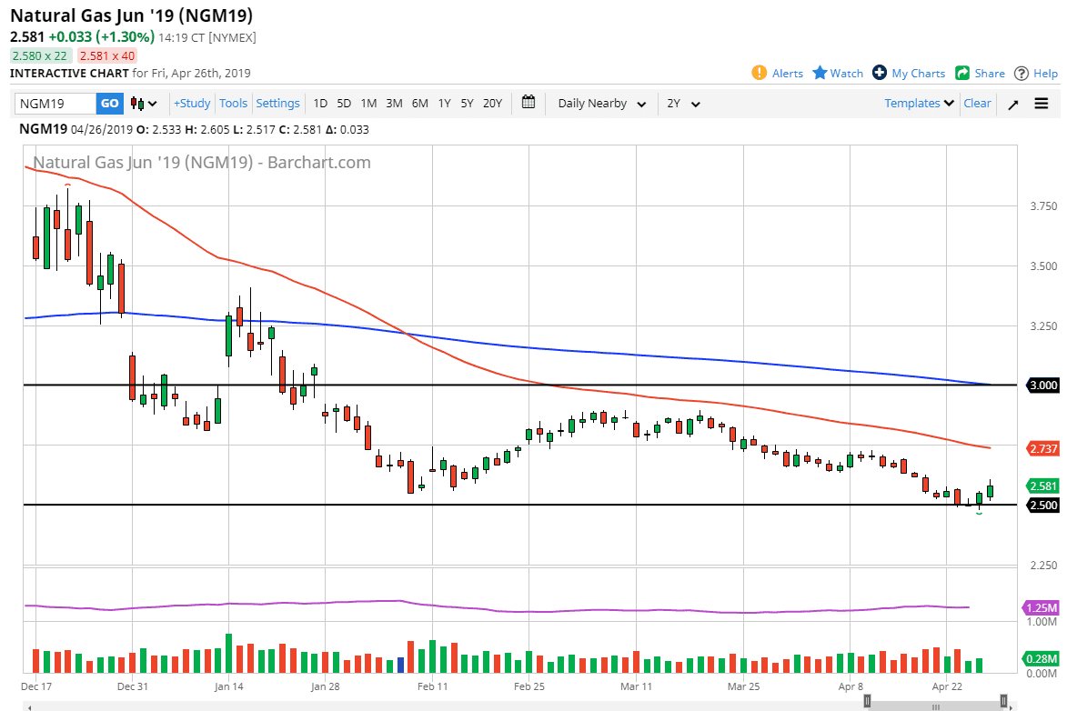 Natural gas markets rallied during the trading session on Friday, as we continue to see the $2.50 level offer a bit of support. By doing so it looks as if we could go looking towards the $2.70 level above, perhaps even higher than that given enough time. However, it’s very negative overall, so I would expect that rallies would be somewhat short-lived. We have been bouncing around between $2.50 on the bottom and $3.00 level on the top, but I think it’s going to take a long time to get back towards the highs again. It will be much easier to sell signs of exhaustion above, as we are not in the right time of year to see significant natural gas rallies. That being said, in the short term we may get a bit of a bounce.
