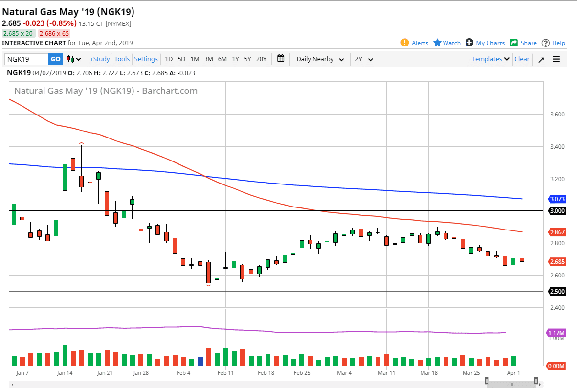 Natural gas markets have gone back and forth, showing signs of lackluster trading during the day on Tuesday. The $2.69 level is the bulk of where we had been trading, and we are simply drifting towards the support level underneath. I believe that support level starts at the $2.60 level, which extends all the way down to the $2.50 level. Above here, we have massive resistance at the $2.90 level that extends all the way to the $3.00 level. Since we are in the middle of this market, I think you have to look to ultra-short-term charts if you want to put any money to work, or you simply have to wait until we get to one of the outer reaches to put money to work. I will be choosing the latter of the two options.