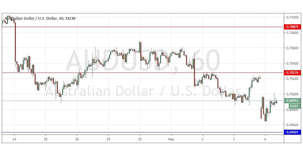 The important support level at 0.6986 was not even touched until the trade war rhetoric over the weekend from the U.S. administration caused markets to open with a gap down on risk assets, and there are few currencies seen as riskier than the Australian Dollar at present. It has been weak anyway lately due to an absence of inflation in the economy. Although the price has recovered a little, these are long-term lows, and if the price breaks below the low made earlier today on strong volatility, I would take a bearish bias. I would definitely not be looking for any long trade entries here.AUDUSDThere is nothing important due today concerning the USD. Regarding the AUD, there will be a release of Retail Sales data at 2:30am London time followed by The RBA Rate Statement and Cash Rate at 5:30am.