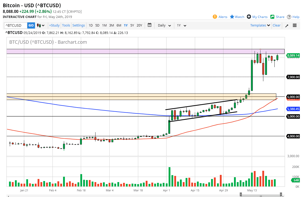 The bitcoin market rallied a bit during the trading session on Friday, reaching towards the same resistance areas that we had seen previously. Because of this, it looks like the market is trying to make a statement but we will obviously have a lot of work ahead of us. Looking at the pink box on the chart, you can see that there has been resistance extending to the $8250 level. If we can break above there, then the market could go much higher, perhaps reaching towards the $10,000 level as it is a large, round, psychologically significant figure, and it is of course an area that we had seen a lot of action at previously.
