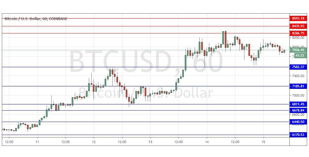 There is no reason not to be generally bullish just because we have had a day of consolidation. I would take a bullish bias above $8,350 or if there is a strong bullish bounce following a bearish retracement to the $7,582 support level.