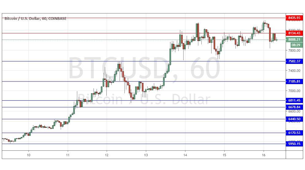 I wrote yesterday that there was no reason not to be generally bullish just because we have had a day of consolidation. I would take a bullish bias above $8,350 or if there is a strong bullish bounce following a bearish retracement to the $7,582 support level.