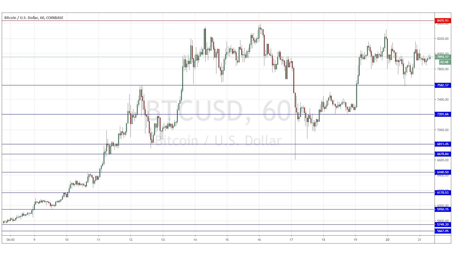Yesterday’s signals produced a long trade from the bullish pin candlestick which rejected the support level at $7,582 which is currently in floating profit. Recent price action suggests it would be wise to close this trade in profit now.