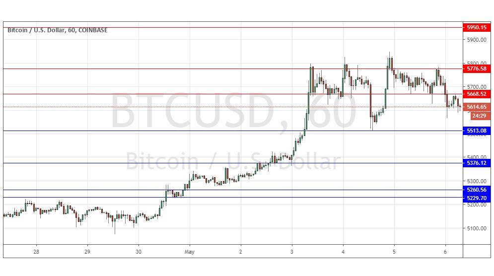 We have a medium or maybe even long-term bullish trend here, although it is relatively weak, however the price has sold in what appears to be a distributive style at about $5,800 on high volatility which is a bearish sign, or at least a sign that trading is going to be messy and action not strongly directional. The lower resistance level printing at $5,669 is a bearish sign, so if the price stays below that level all day today, we will then be likely to see a deeper pullback.