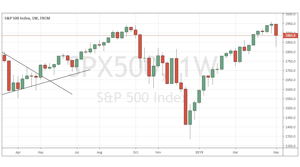 The weekly chart below shows last week produced a large bearish candlestick with a large lower wick. The price is in a long-term upwards trend, above its levels from both three months ago and six months ago – but we have seen some very large and volatile dips since January 2018. Typically, sharp weekly falls within a bull market are followed by strong recoveries over the following week in this stock index. The price looks likely to rise further over the coming week, so I’d be looking to be long above last week’s high price. I take the extra caution of waiting for a break of the high because the fall is caused mostly by the escalation of the trade dispute between the U.S.A. and China.