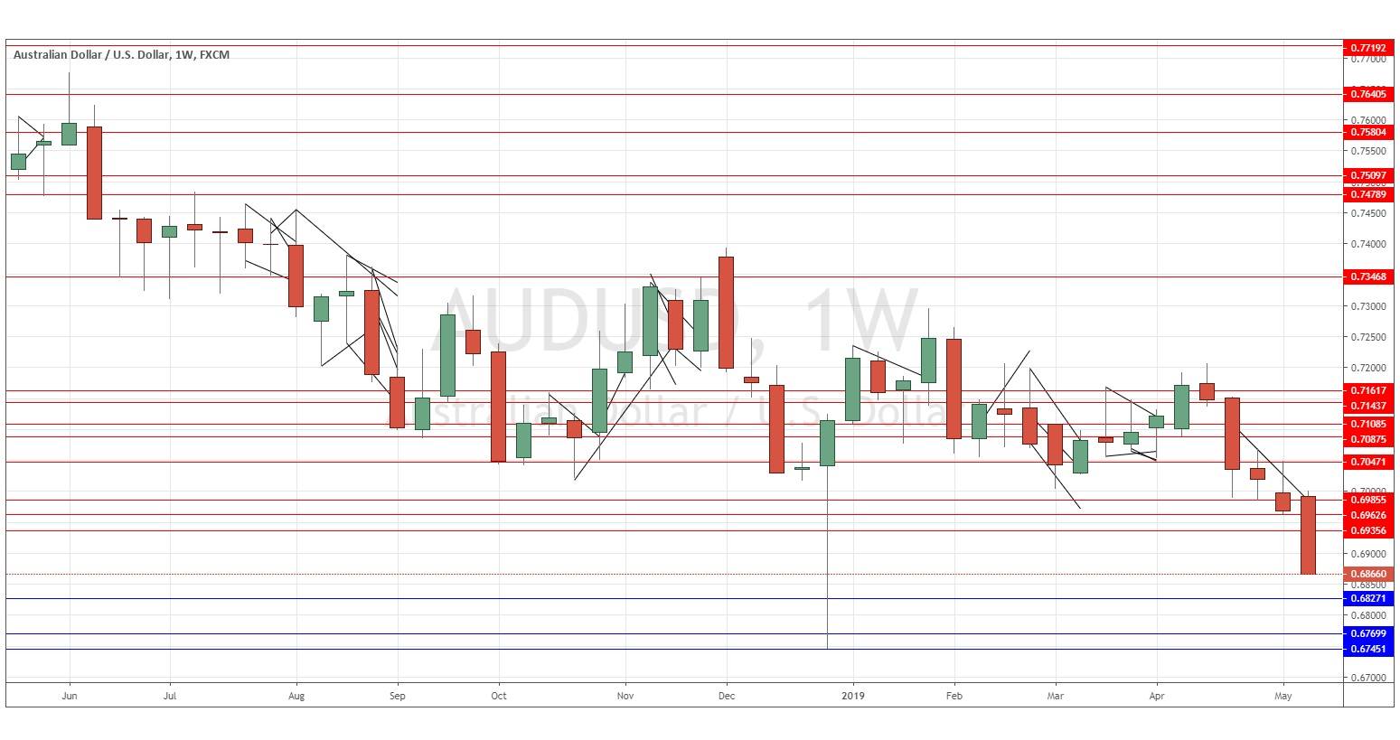 The weekly chart below shows last week saw this pair print a strongly bearish weekly candlestick closing right on its low and being of a relatively large size – these are bearish signs. The price is consistently declining long-term downwards trend, below its levels from both three months ago and six months ago and falling with momentum towards multi-year low prices. The odds favor lower prices over the course of the coming week.