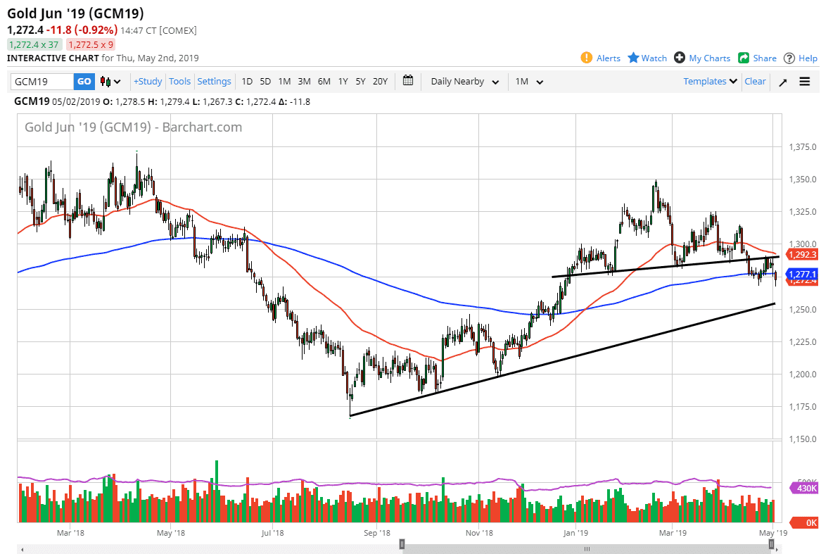 The US dollar strengthened after the Federal Reserve gave no hints whatsoever as to whether or not it was thinking about cutting interest rates going forward. Because of this, the market had to reprice that interest rate risk, and therefore it makes sense that Gold got hit due to the stronger greenback. What’s going to be even more interesting is that Friday is the jobs number, so that will most certainly cause volatility in the greenback, and by extension the gold market.