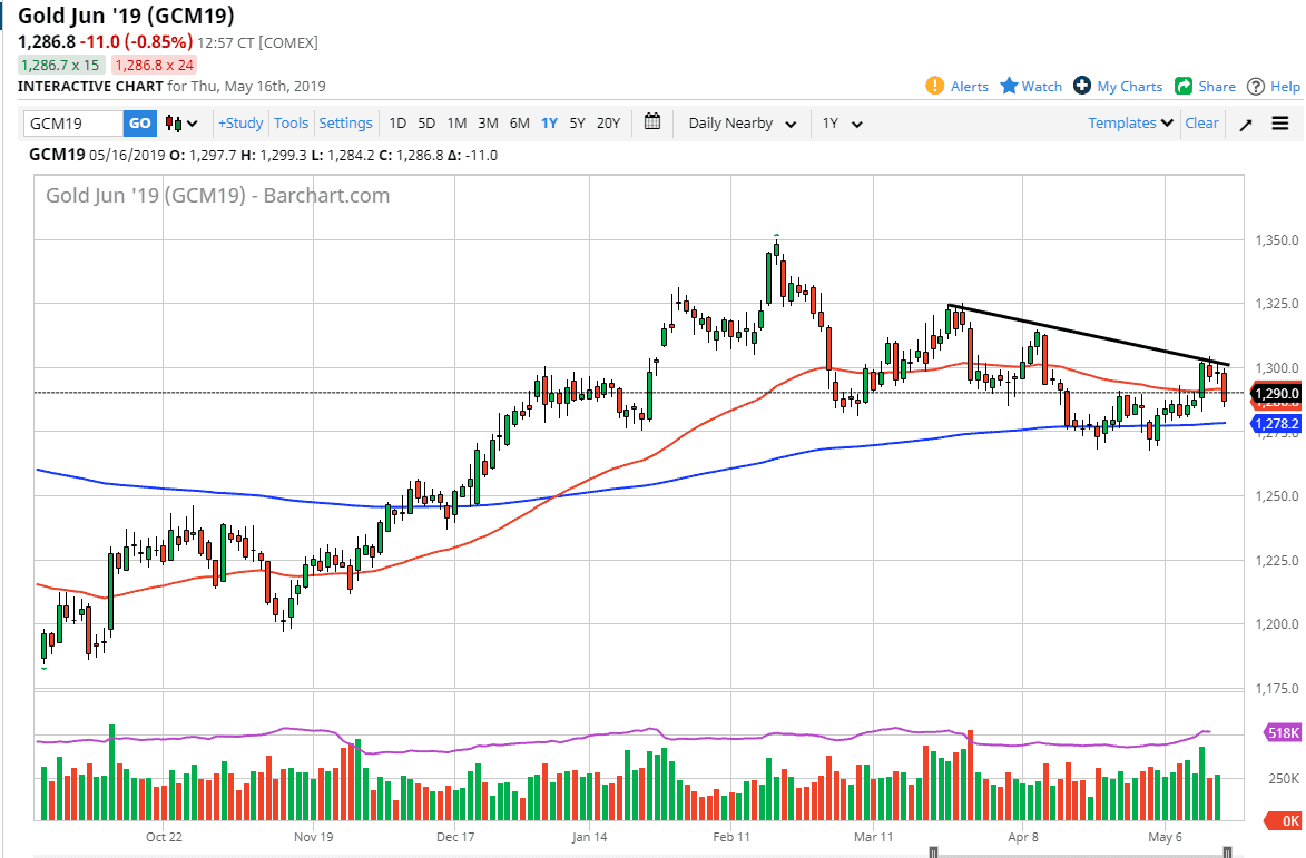 Gold markets fell during the trading session on Thursday, as we continue to see a lot of overall volatility in this market. Looking at the gold market, you can see that we have a downtrend line above that continues to be a bit of a distraction, driving prices lower in a very gradual manner. This doesn’t mean that we won’t have the occasional rally between now and our final destination, but what it does suggest is that perhaps we are going to continue to see conflicting forces taken advantage of this market on an almost daily time frame.