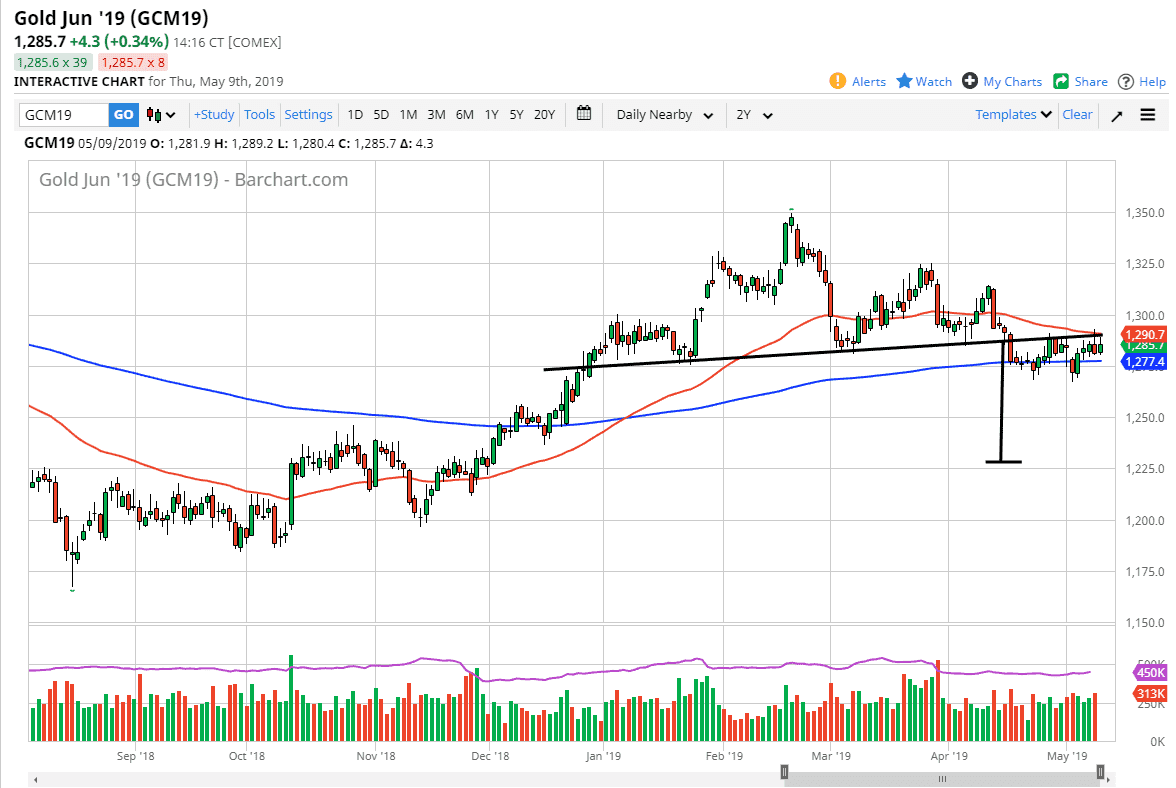 Gold markets rallied initially during the trading session on Thursday but continue to show signs of exhaustion near the $1290 level. Ultimately, this is a market that has recently found a lot of resistance at the previous neckline above, which is connected to the massive head and shoulders. The head and shoulders of course is a very negative pattern, so it does suggest that we are going to break down. The head and shoulders pattern suggests that we could go as low as the $1225 level, but obviously it’s going to take a lot of effort to get down there.