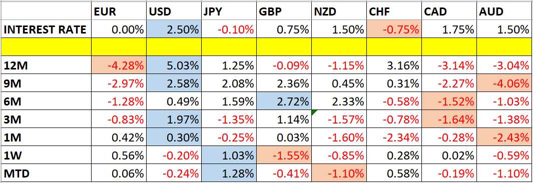 Let’s take a look at the relevant data of currency price changes and interest rates to date, which we compiled using a trade-weighted index of the major global currencies: