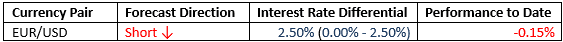 For the month of May, we again forecast that the best trade will be short EUR/USD. The forecast’s performance to date is shown below: