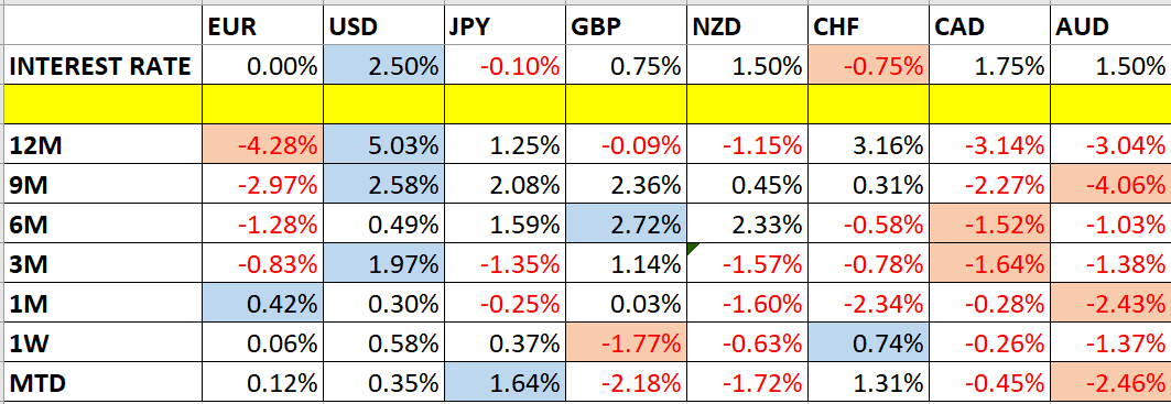 Let’s take a look at the relevant data of currency price changes and interest rates to date, which we compiled using a trade-weighted index of the major global currencies: