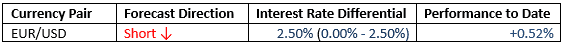 For the month of May, we again forecasted that the best trade will be short EUR/USD. The forecast’s performance to date is shown below: