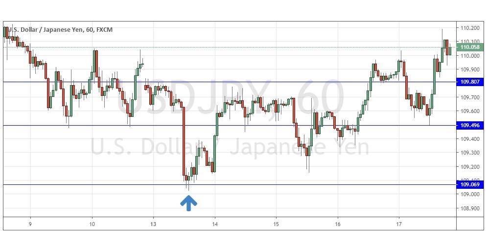 We had expected the level at 109.07 might act as support, as it had acted previously as both support and resistance. Note how these “flipping” levels can work well. The H1 chart below shows the how the price rejected this level near the start of last Monday’s New York session (a great time to trade major currency pairs such as USD/JPY) turning bullish right away with a pin candlestick marked by the up arrow signaling the timing of the turn. This trade has been profitable so far, achieving a maximum positive reward to risk ratio of more than 6 to 1 so far based upon the size of the entry candlestick.