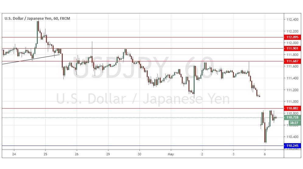 I wrote last Thursday that the situation was still slightly bearish as long as the price was unable to break above 111.69, and the bulls appeared to have failed there again in recent hours. I thought that the price would consolidate until the non-farm payroll releases due Friday after Tokyo closed so I had no directional bias. This was a good call as the price did consolidate under the resistance at 110.69 during that period.