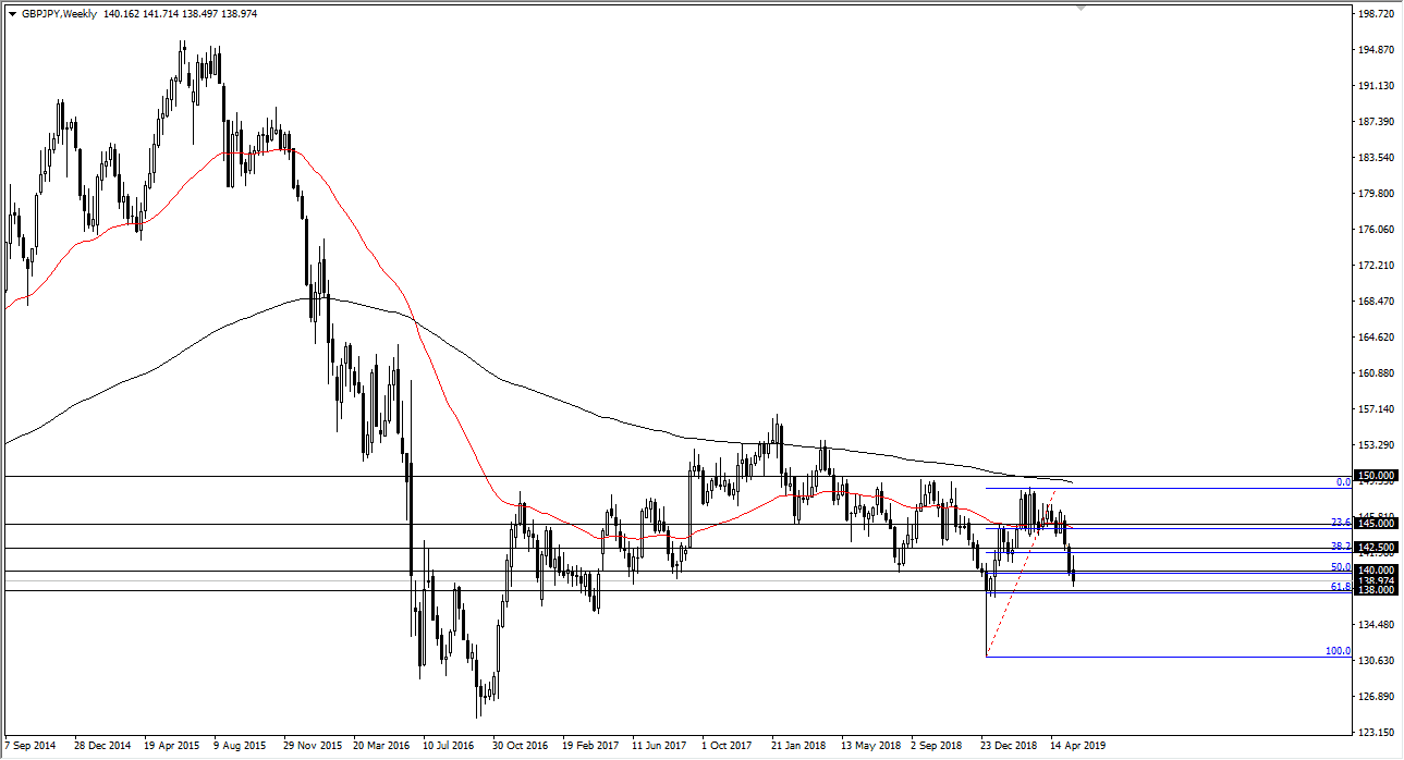 The British pound initially rallied during the week but has been repelled by the ¥142 level. By doing so, we have broken significantly lower, finding a bit of support near the ¥138 region. That is the 61.8% Fibonacci retracement level, and I think what we are going to see is a lot of choppiness during the week but if we do break down below the ¥138 level, look out below as we will more than likely drop another 300 pips rather quickly.