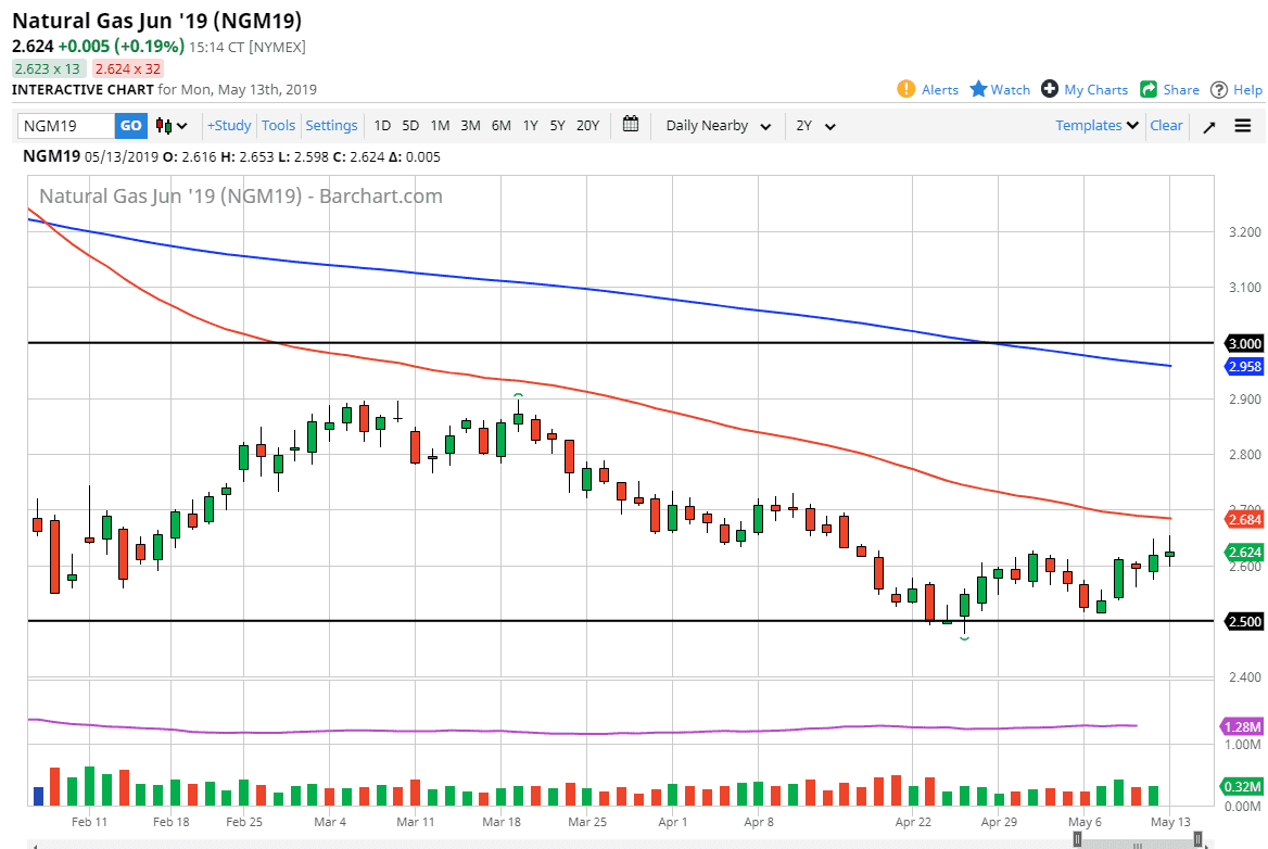 Natural gas markets continue to go back and forth, with a slight gain being the result. However, we have a lot of resistance above, in not only the $2.70 level, but also the 50 day EMA which is currently just below that level. Because of this, I think signs of exhaustion will continue to be sold, and therefore I think it remains a short-term traders type of situation. Seasonally speaking, we shouldn’t get much in the way of a rally, but if we do it will more than likely be punished right away. Any move above the $2.70 level would be a bit surprising and could bring in fresh buying. At that point, I’d be looking to sell closer to the $2.90 level.