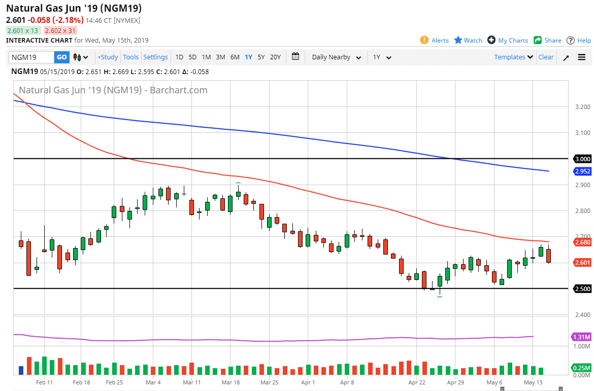 Natural gas markets initially tried to rally during the trading session on Wednesday but found enough resistance again at the 50 day EMA to turn over and roll over. As we did that, the market reached towards the $2.60 level, an area that is important as it is a large round number, but at this point it’s an area that was previous resistance and could now be supported. However, we are in the longer-term downtrend and of course we have close towards the bottom of the candle stick. If we do, the market probably goes looking towards the $2.50 level yet again, an area that is massive support from a longer-term perspective. As far as buying is concerned, I have no interest in doing so.