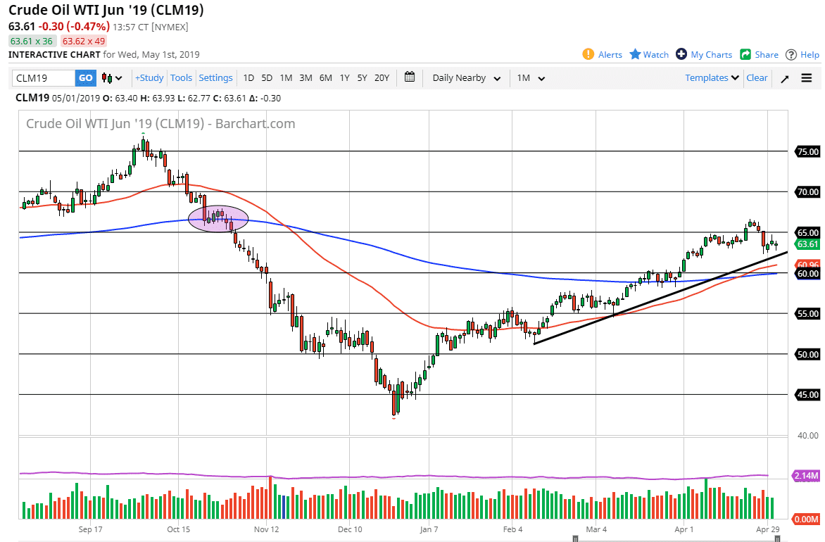 The WTI Crude Oil market initially pulled back during the trading session on Wednesday but has seen enough buying pressure underneath to push things back and show signs of a recovery. However, there is a lot of resistance just above at the $65 level and it should be pointed out that last week’s candle was horrific looking. I think at this point the oil market is getting ready to make some type of longer-term statement, so expect it to be very difficult to break above. With that being the case it’s very likely that we go back and forth over the next several days. The uptrend line should be paid attention to, just as the 50 day EMA should as well. The $60 level would be the first sign of significant support on a break down if and when we get it. To the upside, if we were to be able to make a fresh, new high then we could go looking towards the $70 level.