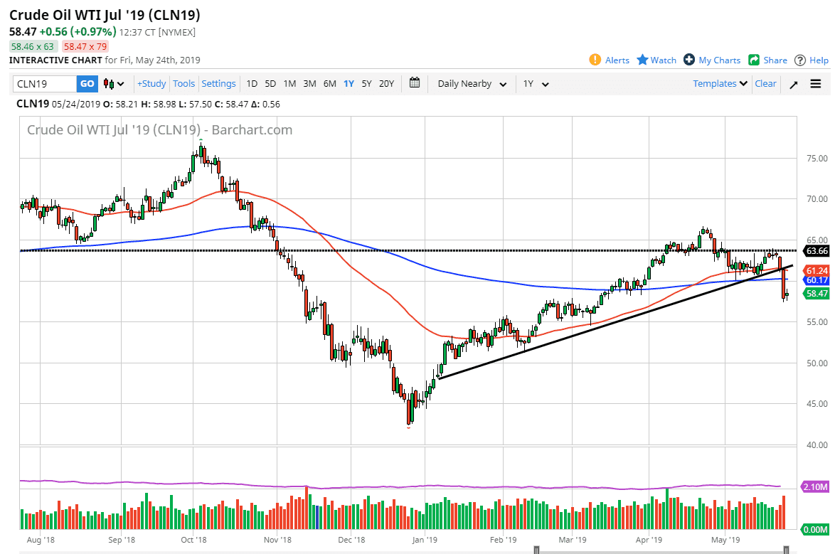 The WTI Crude Oil market went back and forth during low volume trading on Friday. After all, we had seen the lot of selling pressure during the Thursday session and we were going into the Memorial Day weekend in the United States. This means that there would be very little in the way of volume on Friday. At this point in time, we had broken down below a major trendline, and now it looks like any rally will be sold into. I anticipate that the move down to the $55 level is all but assured, but we will have the occasional rally. Those rallies should be opportunities that you can take advantage of as we have seen a complete collapse in the idea of global growth, and at this point it makes sense that as long as the US/China negotiations continue to keep hope low.