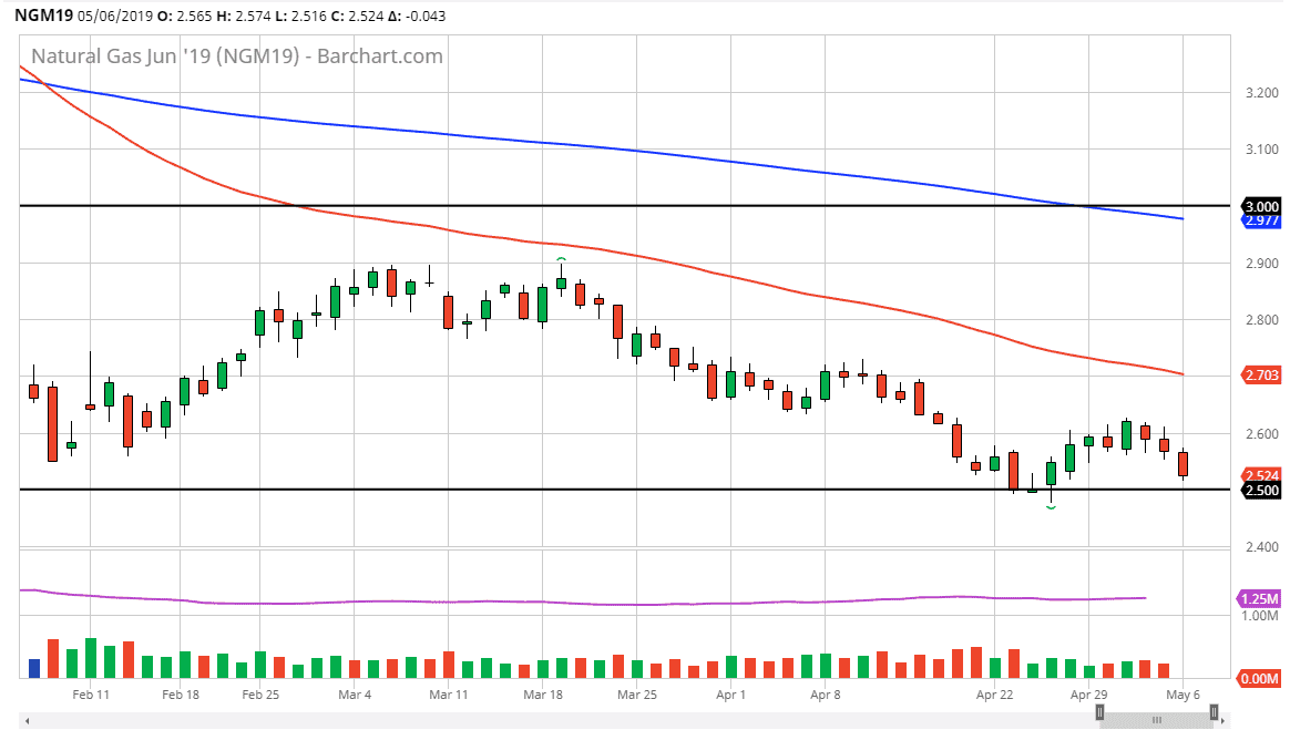Natural gas markets fell again during the trading session on Monday, as we continue to see a lot of negative pressure in the natural gas markets. The $2.50 level underneath continues to be massive support, as it is an area where we’ve seen the lot of buying in the past. By breaking that level to the downside, we could reach towards the $2.25 level, as the market tends to move in $0.25 increments.