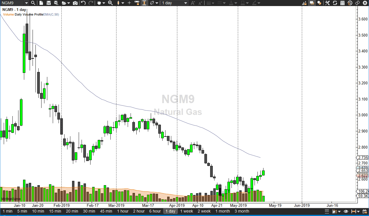 Natural gas markets continue to drift a little bit higher as perhaps they had gotten oversold. Now that we are at the $2.65 level, it’s very likely that we could drift towards the $2.70 level given enough time. At that point, we should start to run into the 50 day EMA which should offer a bit of technical resistance. It’s not to say that we can’t go higher, it’s just that it’s much easier to short this market this time of year. The demand for natural gas will shrink, as heating is no longer an issue in the northern hemisphere. To the downside, I see the $2.50 level as the “floor” in the market. I’m looking to fade short-term rallies but have not had the opportunity yet.