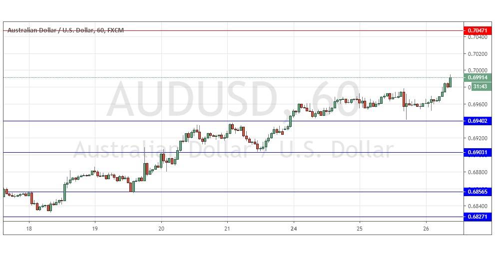 I wrote yesterday that the short and medium-term pictures were solidly bullish. I thought that the price was quite likely to reach 0.7000, but that it would probably not get much further than that before turning bearish and making a bearish retracement. Alternatively, if the price retraced first to 0.6940 and bounced bullishly there, I was ready to take a cautious bullish bias.
