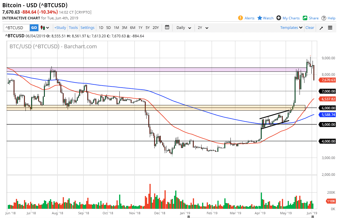 Bitcoin markets took a hammering during the trading session on Tuesday, breaking back below the $8000 level. This isn’t much of a surprise though, because quite frankly we had gotten a bit ahead of ourselves recently. Remember, just two months ago we were down at $4900 and trying to break above the $5000 level. We have almost doubled since then and started to pull back. This is a good sign, I do not like the idea of trying to hang on for some type of massive “moonshot” like some traders had been doing a couple of years ago.