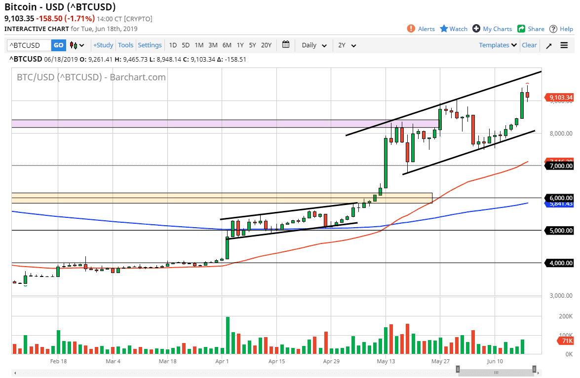 Bitcoin markets went back and forth during the trading session on Tuesday, as we reached towards the $9200 level. We gave back some of the gains though, but at this point it’s very obvious that the market is bullish but calming down as we head into the Wednesday session. If you think about though, that makes perfect sense as the Federal Reserve is going to have a major statement coming out for the Wednesday session. Unfortunately, most crypto traders don’t understand that they are going anything other than trading one currency against another. In one sense, it’s basically the same thing as Forex trading.