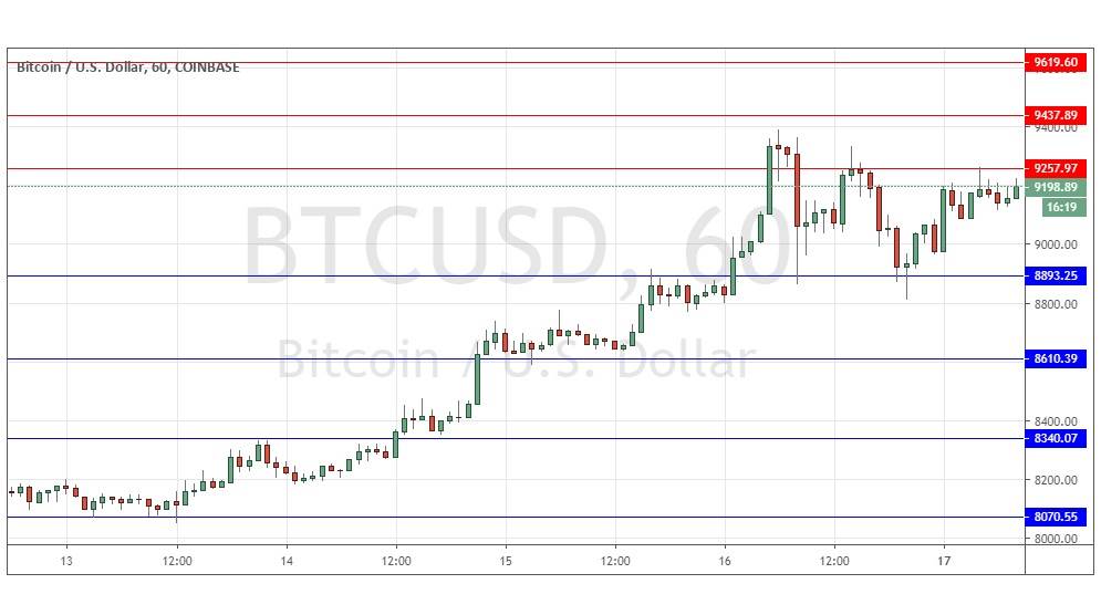 The picture now shows a bullish consolidation between $8,893 and $9,400. I would be very, very careful in taking any short trades here now over the next day. I am fine with long trades.