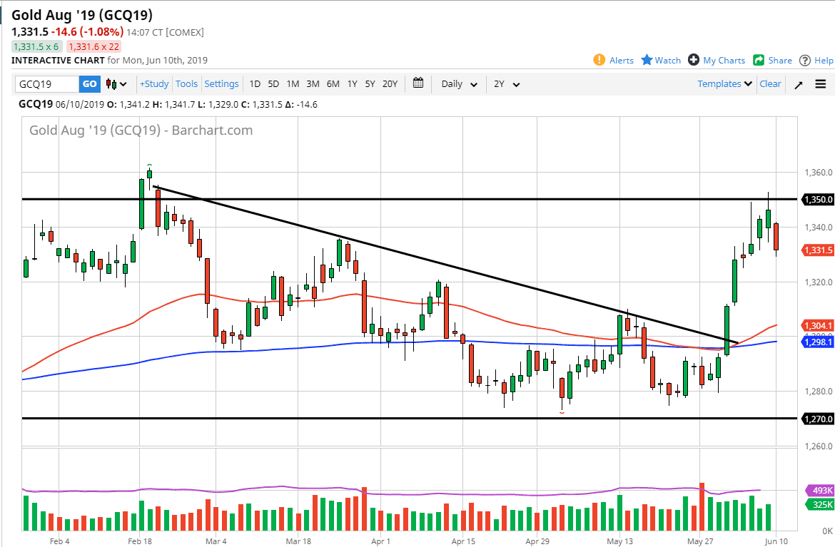 The Federal Reserve easing its monetary policy of course gives a bit of a boost for gold, but the fact that gold has sold off is a bit interesting as the monetary policy has shifted. The question now is whether or not it is a bit of a sign that we are becoming more comfortable, perhaps as the stock markets rally. However, there is a lot of volatility to say the least and I think the easiest way to deal with this market is to understand that we are simply overbought. The next question is whether or not we break down below the candle stick for the session, because if we do then I think we drop down to the $1320 level. It is at that level that we will probably have to ask questions again. If we break down below $1320, then we almost certainly will go down to the 50 day EMA underneath. If we do rally from here without pulling back significantly, I will probably look to fade this market the closer we get to the $1350 level. Alternately, if we did manage to break above the highs on Friday, then perhaps we go even further but it is overbought to say the least.