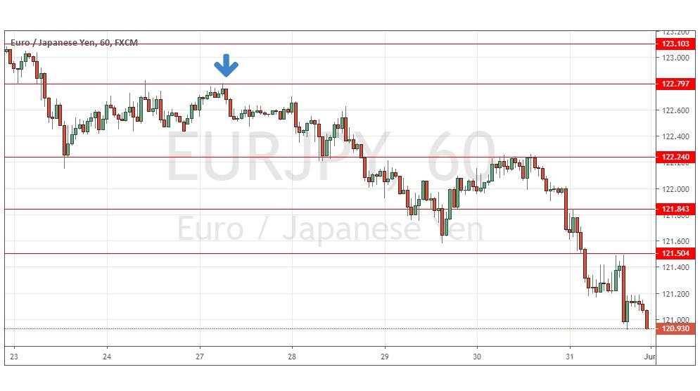 We had expected the level at 122.80 might act as resistance, as it had acted previously as both support and resistance. Note how these “flipping” levels can work well. The H1 chart below shows how the price rejected this level towards the end of last Monday’s Asian session session (a great time to trade partly Asian currency pairs such as EUR/JPY) turning bearish right away with an engulfing candlestick marked by the down arrow signaling the timing of the turn. This trade was profitable, achieving a maximum positive reward to risk ratio of approximately 9 to 1 so far based upon the size of the entry candlestick so far.