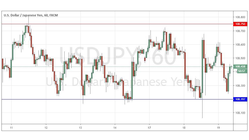 Yesterday’s signals may have produced a long trade from the very large, bullish outside candlestick which rejected the support level at 108.20. This trade is still open and may eventually turn into profit, but it could take a long time. It might be wise to be prepared to take a partial loss if in this long trade, as the major releases due later for both currencies is likely to produce volatile price movement.