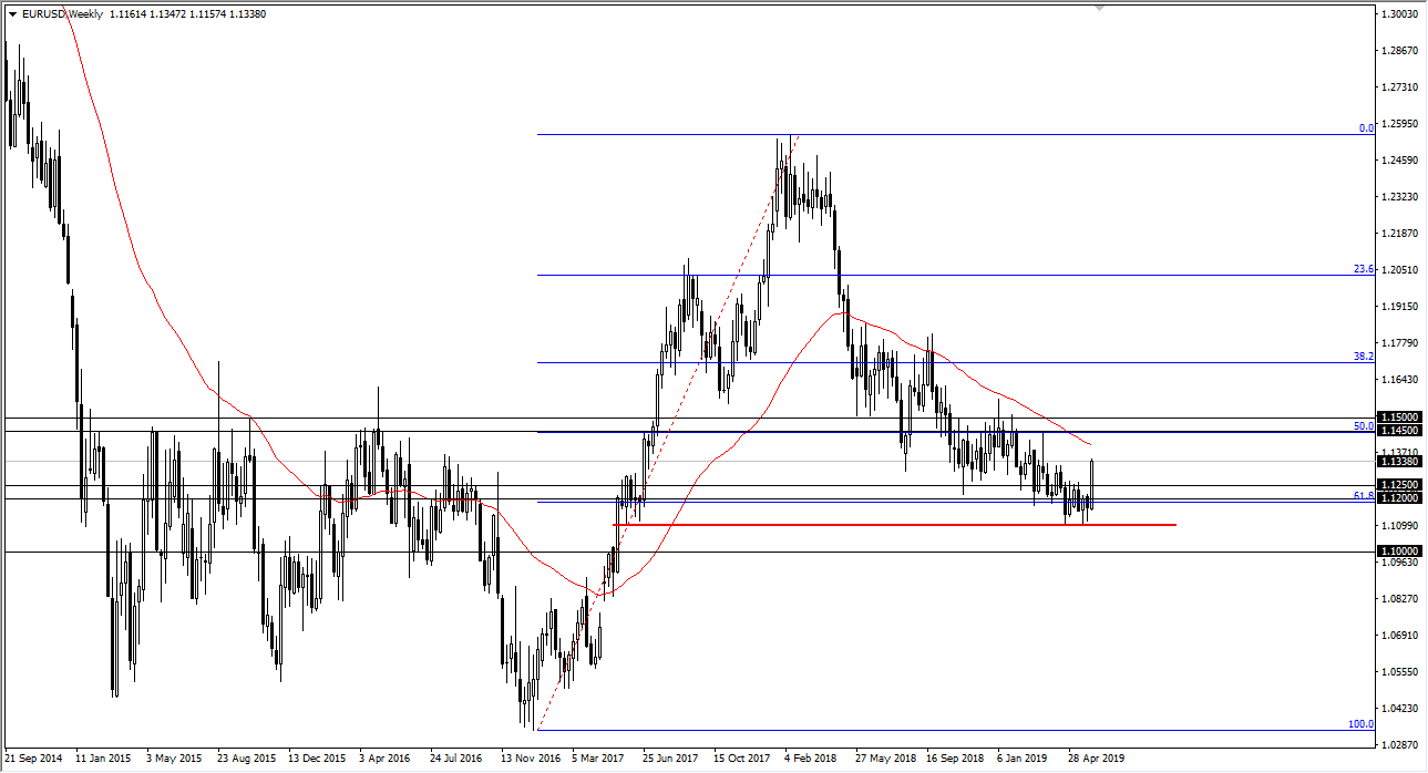 The Euro rallied significantly during the week, breaking above the 1.13 level in a strong sign of bullish pressure. Ultimately, the market looks as if it is trying to change its overall direction, and I think short-term pullbacks are going to offer buying opportunities now that we have seen this bullish turnaround and of course the Federal Reserve stepping away from its tight monetary policy.