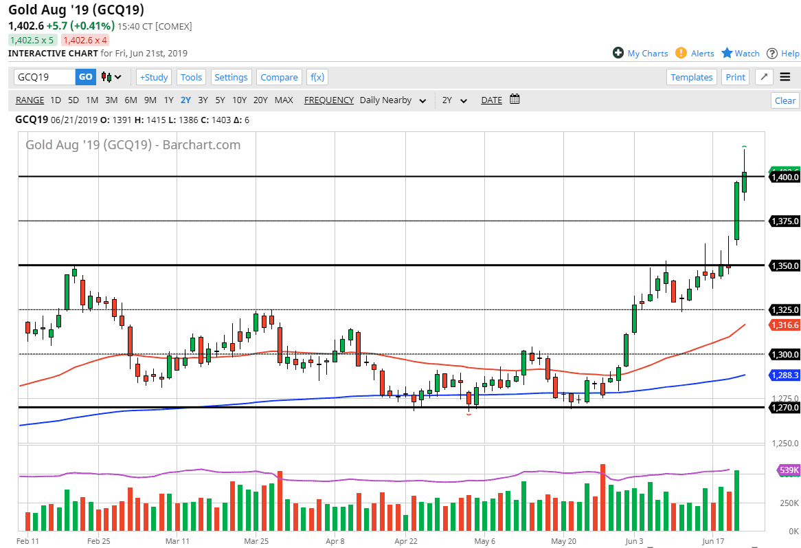 Gold markets broke higher during the trading session on Friday, breaking above the crucial $1400 level. That being said we did sell off quite drastically, and now it looks as if we are closing just above there, but it isn’t exactly the most bullish of candlesticks. That being said, only a fool would try to short this market.