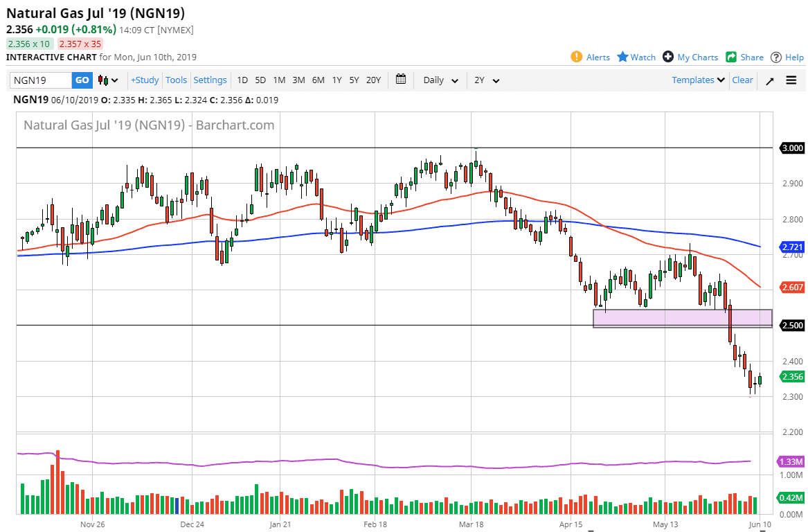 Natural gas markets rallied a bit during the trading session on Monday, in a slight attempt to stabilize the market. The $2.30 level underneath should be supportive, but at the end of the day I think we are oversold so I think a bounce is probably coming. The $2.50 level above should be resistance, as it was massive support in the past. At this point in time, it’s very likely that we will see a lot of selling pressure once we get there, not to mention at the $2.60 level above there which is the 50 day EMA.