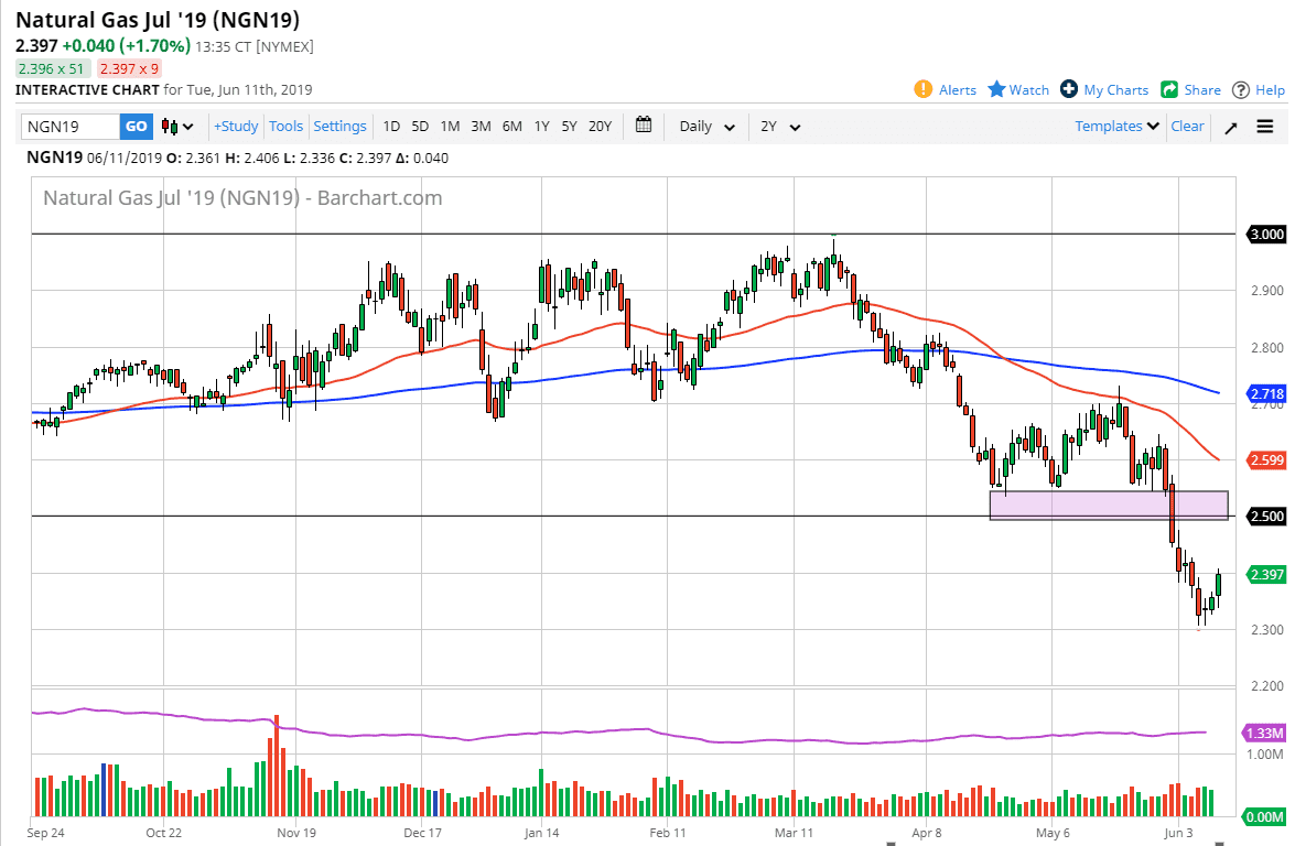 Natural gas markets initially fell a bit during the trading session on Tuesday but then shot higher to reach towards the $2.40 level. Ultimately, I think we still have some room to go to the upside but I’m not willing to buy this market. I think waiting for some type bit of exhaustive candle in a higher level is probably the best way to go. The $2.50 level above is a previous support and should now be massive resistance. If that’s going to be the case, I think that it’s only a matter of time before we consider selling and I welcome this rally as an opportunity to sell from higher levels. I believe that there is resistance at the $2.67 level as well, as it features the 50 day EMA. I have no interest in trying to buy this market in the meantime though.