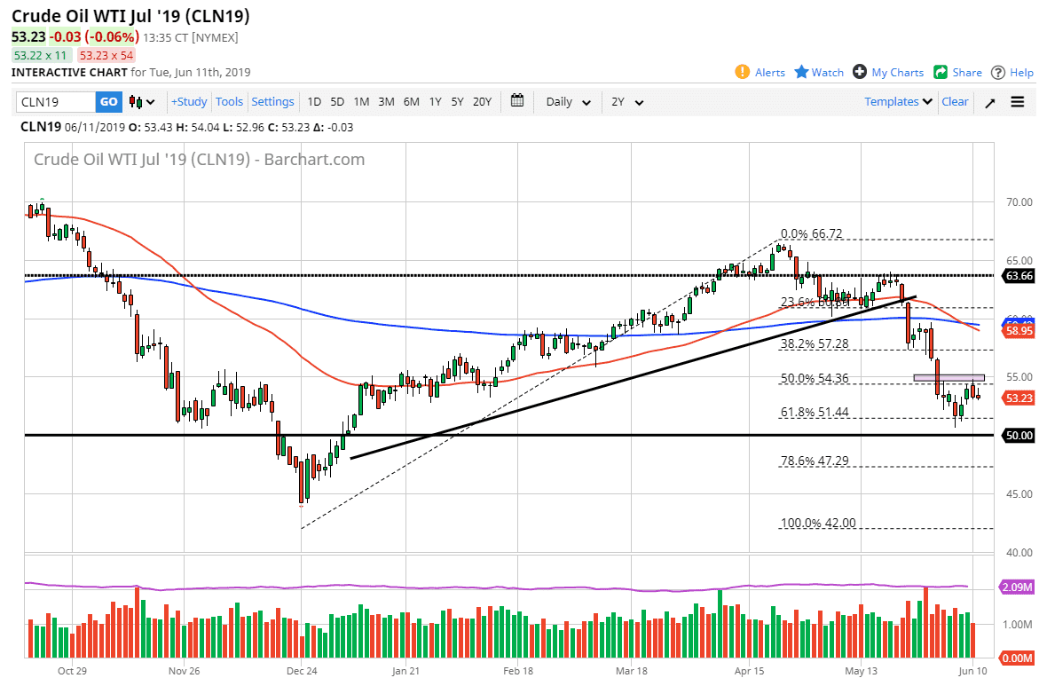 The WTI Crude Oil market shot higher initially to kick off the day on Tuesday, as we attempt to reach towards the $55 level, which of course is psychologically important. We have recently bounced though, so the question now is whether or not we are trying to build a base or are we going to break down? At this point, I suspect we are trying to build a bit of a base because we have sold off so significantly.