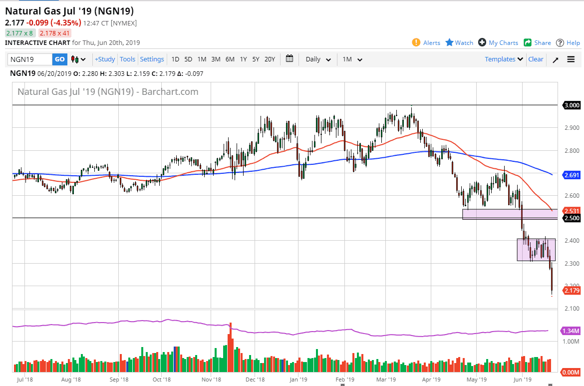 Natural gas markets absolutely collapsed during the trading session on Thursday, breaking below the vital $2.30 level and drifting down towards the $2.26 level after that. This market is so oversold that I don’t really know what to do with it other than to wait for rallies to show signs of exhaustion that I can sell into. This is a market that doesn’t typically do well this time of year anyway, but the fact that there are a lot of concerns about global growth signifies or perhaps demand might drop beyond the usual heating or cooling situation.