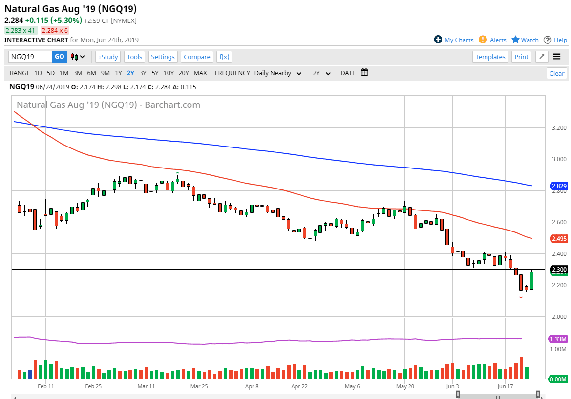 Natural gas markets have rallied significantly during the trading session on Monday, reaching towards the $2.30 level. That’s an area that was a significant support level, so the fact that we reached towards that area and stopped tells me that there is still plenty of selling pressure in that area, so I think at this point signs of exhaustion will be sold in this market as we are too far oversupplied. Overall, this is a market that you sell every opportunity you get between now and Fall.
