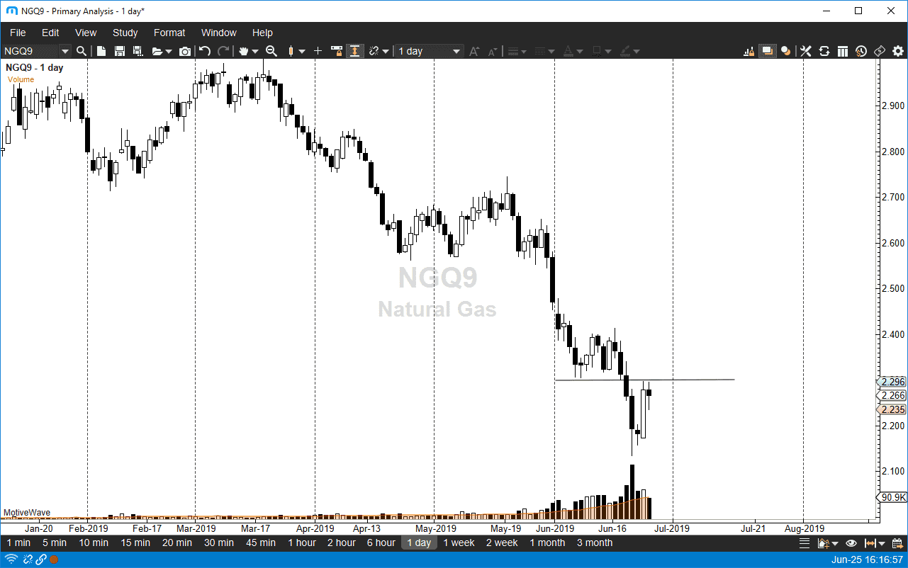 Natural gas markets continue to be a bit noisy, as we fell during the trading session but turned around to show signs of life. The $2.30 level should cause significant resistance so I think at this point it’s very unlikely that the market will break above there quite easily, but even if we did I think there is a lot of resistance extending all the way to the $2.40 level, so at this point I’m simply looking for exhaustion to take advantage of as we are in a huge downtrend and at this point it’s very likely it will continue due to the time of year that we are currently in. I’m simply looking for opportunities to sell at higher levels.